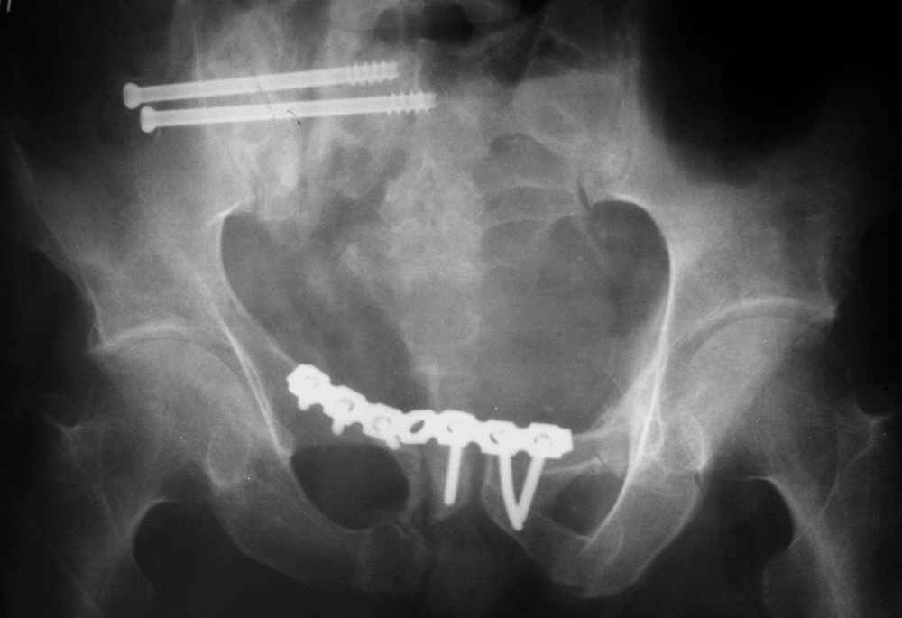 Вероятный план: остеотомия лонной и седалищной костей справа, остетомия или закрытый разрыв крестца в кольцевом аппарате, низведение и компрессия половины таза, илиосакральное блокирование справа.