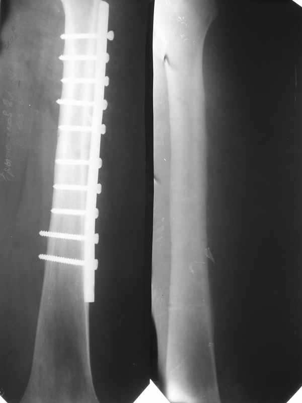 Уважаемые коллеги! Две недели назади мы прооперировали данного пациента: монтаж аппарата таз-бедро (с двусторонней фиксацией за крылья) и постепенная дистракция. Достигнуто низведение бедра.