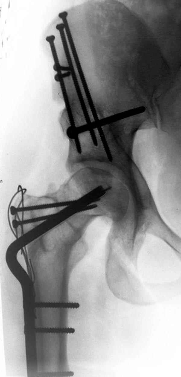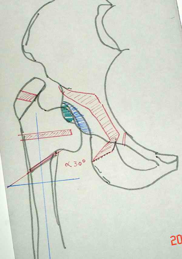 Depending upon surgeon preference, as well as availability of adequate operating room equipment and staff, this reconstruction can be done in two stages: periacetabular osteotomy with correction of acetabular retroversion would be the first stage. The second stage would involve a proximal femoral valgus osteotomy with neck lengthening.