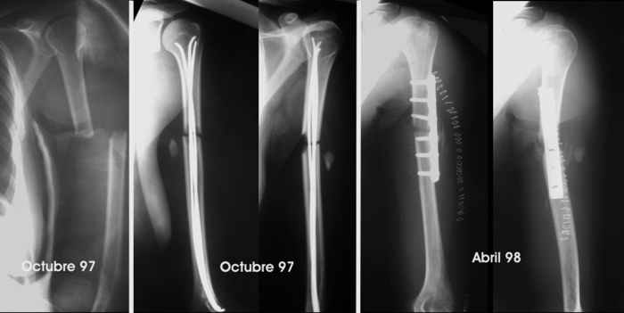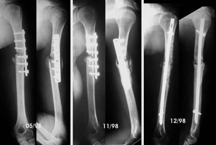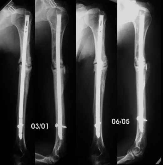 Dear list members: I would like your opinion in this case. A 30 yo woman suffered 8 years ago an accident. She was close to a tractor power take-off and her clothes caught her. She was pulled towards the tractor and suffered several rib fractures and this humeral fracture (AO-OTA 12-B2). No radial paralysis. She was fixed with Hackettal elastic nailing. Six months later there was no signs of healing so she accepted to revise the fracture. We used compression plating and autologous iliac bone grafting on April 98. By the end of May, she complained of sudden pain during physiotherapy, and came with the bottom left x-Ray. We advised to revise the operation, but she wanted to wait in a brace, but by November the humerus hadn't healed so we advised to remove the plate, add more bone graft and nail it. Which we did. The patient regained full motion and used the arm almost freely till now. She has been working as waitress, postman... although the x-ray never showed healing. She has never wanted to be operated again because the limb was almost pain free. She come again to my office about 2 months ago complaining of pain, she was carrying an X-ray in which it was visible that the nail was broken.Mysteriously those x-rays are lost, and in a new x-Ray I token, I couldn't see the fracture in the nail. Anyway. What would be your advice? Renailing or replating, or something else. Thanks in advance. Dr. Josep M. Muñoz Vives Orthopaedic Surgery Department Hospital Universitari de Girona 'Dr. Josep Trueta' Girona Catalonia Spain