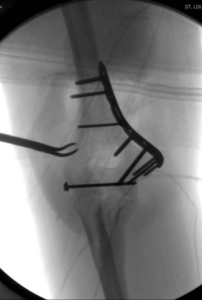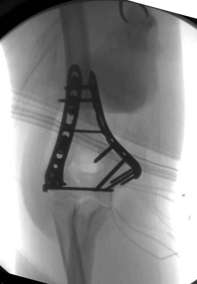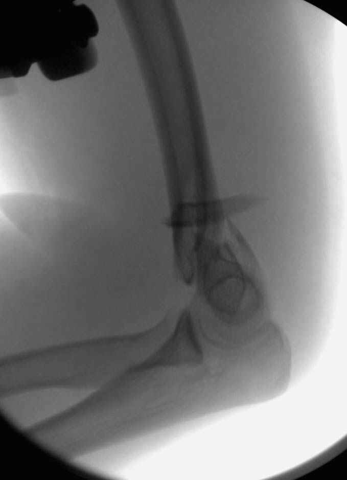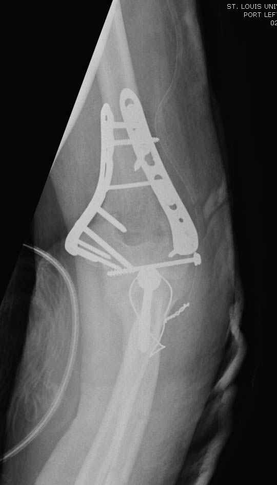 На шестой день сделали открытую репозицию чрезлоктевым доступом двумя locking plate, локтевой нерв был ушибленным, после операции положительная динамика в Flexor Carpi Ulnaris. Фиксацию локтевого отростка произвели tension band technique с дополнительным шурупом.