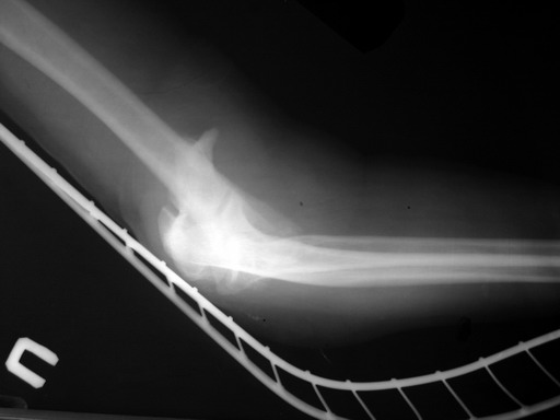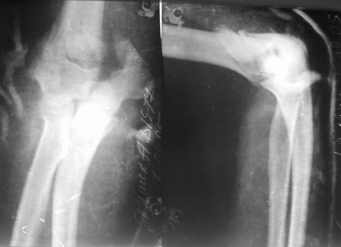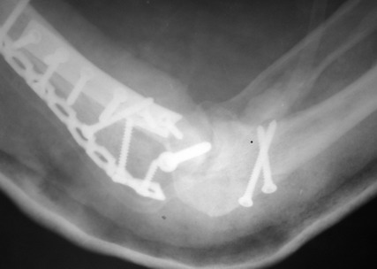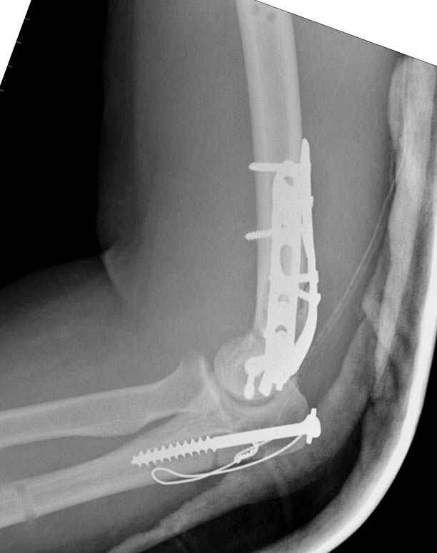 На шестой день сделали открытую репозицию чрезлоктевым доступом двумя locking plate, локтевой нерв был ушибленным, после операции положительная динамика в Flexor Carpi Ulnaris. Фиксацию локтевого отростка произвели tension band technique с дополнительным шурупом.