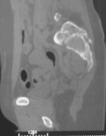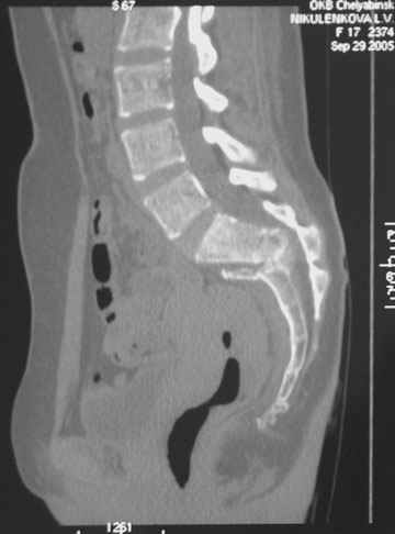 В отделение детской ортопедии нашей больницы поступила больная 17 лет. Травма 21.августа 2005г. На девочку в лесу упала береза. Доставлена в ближайшую ЦРБ. При поступлении установлен диагноз: Травматический шок 2-3 ст. Тупая травма живота. Забрюшинная гематома. Перелом костей таза с нарушением целостности тазового кольца. Перелом лонной и седалищной костей справа. Перелом поперечных отростков L3 - L5. Разрыв КПС справа. При поступлении выполнена диагностическая лапароскопия — выявлена обширная забрюшинная гематома. Было наложено скелетное вытяжение за бугристости обеих б/берцовых костей, больная уложена в гамак. Через неделю скелетное вытяжение демонтировано, гамак снят. Девочка уложена в положение «лягушки». Контрольные рентгенограммы через 4 недели после травмы. Заподозрен перелом дужки L5. Больная 26 сентября 2005 г. переведена в областную больницу в отделение детской ортопедии. При поступлении в локальном статусе: пальпация и перкуссия остистых и поперечных отростков L4-5 болезненная. Пальпация костей таза б/болезненная. С-м натяжения слабо положителен. Осевая нагрузка положительная. Движения в т/б суставах ограничены, болезненны. C-м прилипшей пятки отрицательный. C-м Ларрея и Варнейля отрицательный. Периферическая гемодинамика не нарушена.Неврологический статус: вторичная двусторонняя радикулопатия L5-S1. 29 сентября произведена компьютерная томография позвоночника и таза. < | >