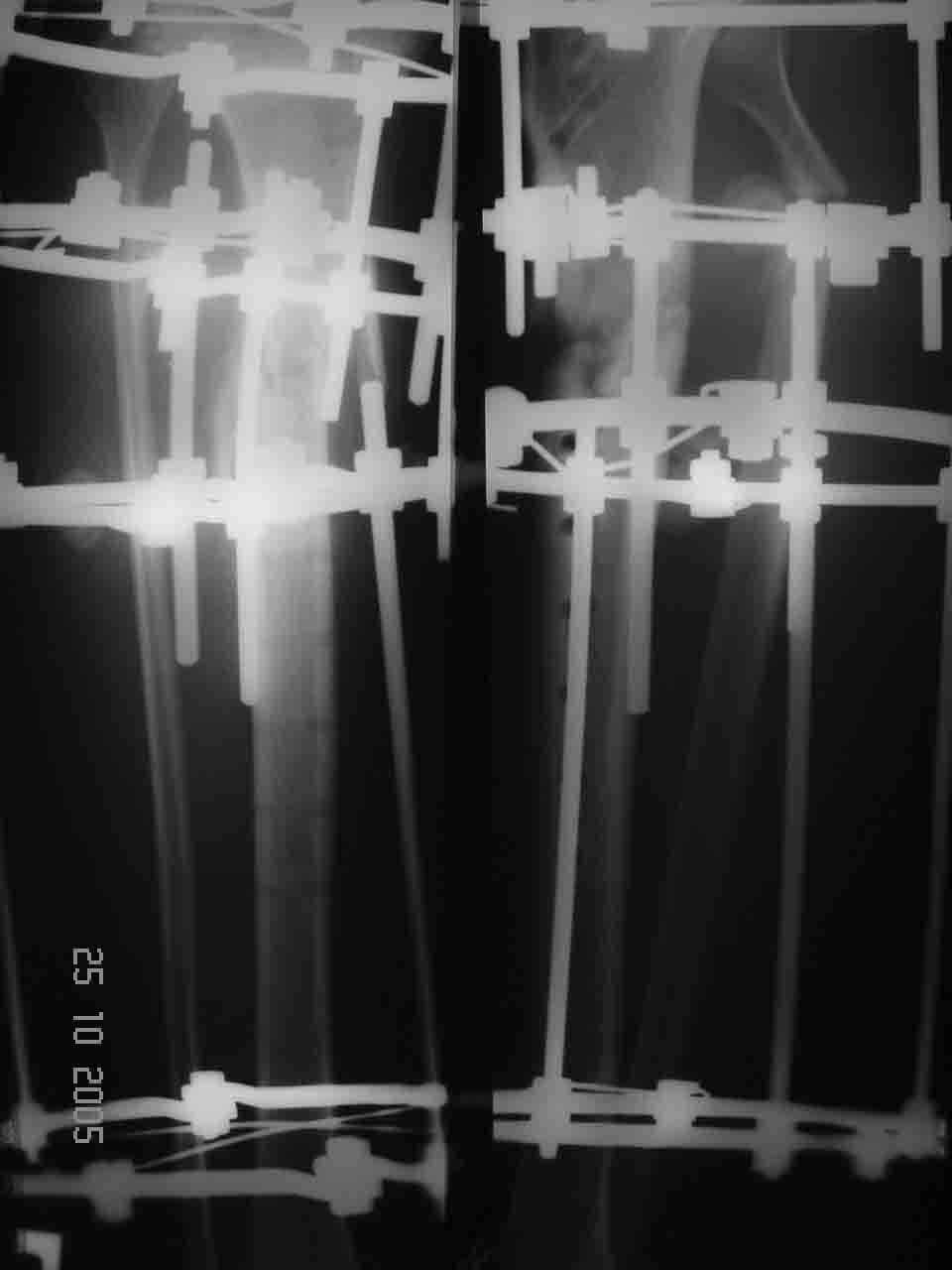 На операции после удаления пластины вывалился промежуточный свободный фрагмент,оставлять его посчитали нецелесообразным. После его удаления вскрыли костномозговой канал, зашили рану и наложили аппарат. После заживления раны концы отломков сблизили. Возможно, всё это же можно было бы сделать одномоментно и на стержне. Но как то мы не решились забить гвоздь при наличии большой раны и костного дефекта. Сейчас 2 недели после операции, больной ходит при помощи костылей с одинаковой нагрузкой на обе ноги. Укорочение в итоге 1,5 см. Обязуюсь показать снимки через пару месяцев.