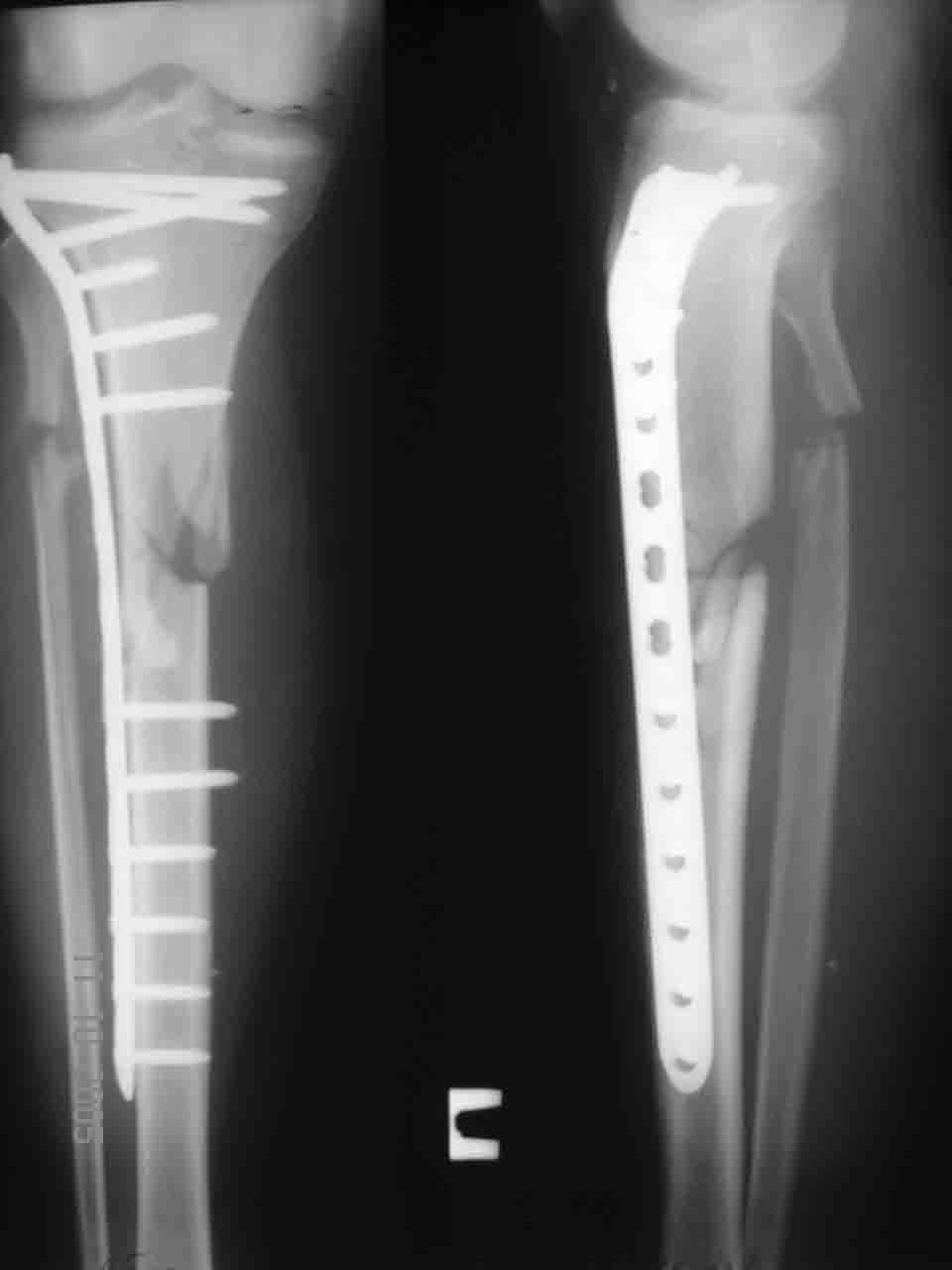 Слева был выполнен интрамедуллярный остеосинтез UTN, справа пластиной LCP. Через два месяца разрешили ходить при помощи костылей с преимущественной нагрузкой на левую ногу. Произошел перелом пластины. Планируем удалить пластину и наложить аппарат Илизарова, также рассматривали вариант интрамедуллярного остеосинтеза. Ваше мнение?