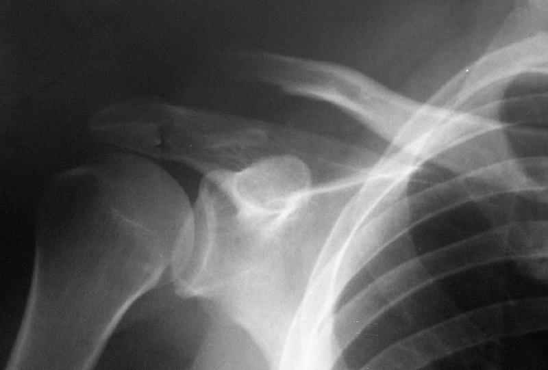 "Толкатель" - укороченная спица с упором. На первичных снимках - оскольчатый перелом, отдельный фрагмент с местом прикрепления кл-кл связки сместился каудально.