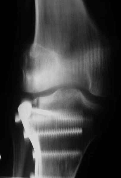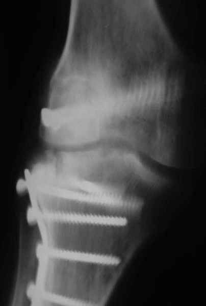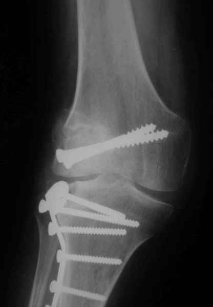На прием обратилась больная 38 лет. Травма 17.01.2005. 23.01.2005 - операция в одном из стационаров области - остеосинтез мыщелка бедра винтами, Остосинтез мыщелка большеберцовой кости L-образной пластиной.