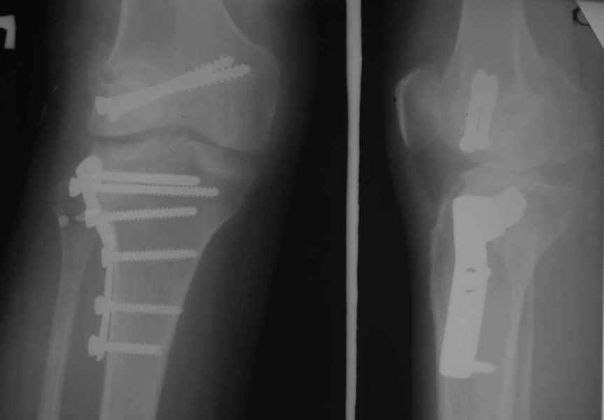 С учетом всего сказанного - наличия прогессирующего вальгуса конечности, довольно приличного объема движений, имеющегося, вероятно, некроза мыщелка бедра, наиболее рациональным представляется удалить пластину с б\б кости, произвести остеотомию б\б кости с коррекцией вальгуса, разгрузив тем самым наружный отдел сустава, и синтезировать фрагменты голени накостным фиксатором. Максимально тано начать восстановление движений в суставе. Скорее всего рано или поздно речь о протезировании всеже возникнет, но мы хотя бы будем иметь приличную ось конечности.
