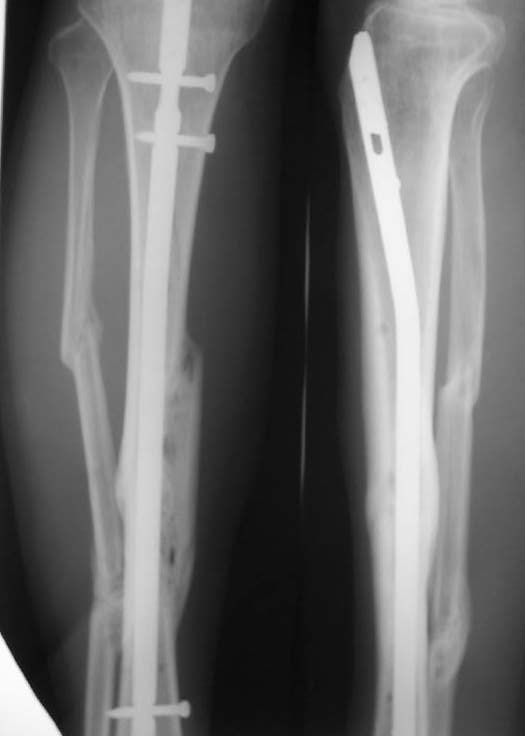 У нас, наверно, была бы сделана чрескожная остеотомия малоберцовой кости, формирование и рассверливание канала большеберцовой, закрытая остеоклазия, и закрытое же штифтование. За счет устранения варуса дефицит длины уменьшится. Можно и подтянуть дистрактором одномоментно.