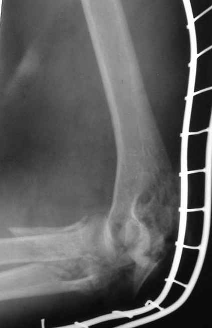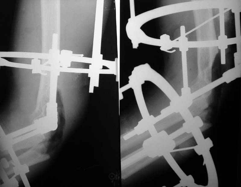 Думаю, в этой ситуации действительно лучшим выбором будет аппарат внешней фиксации, но при ПХО его повсей видимости придется дополнять фиксацией отдельными спицами. Репозиция позволит по всей видимости сохранить основной массив локтевого отростка и блока плечевой кости. Я бы дополнил обработку катетеризацией плечевой артерии для регионарной химиотерапии. В послеоперационном периоде возможно вторичное заживление ран. Абсолютно согласен с тем что после заживления ран необходимо будет повторно преоценить ортопедическую ситуацию исходя из оставшихся приживших фрагментов кости и повторно разрабатывать тактику восстановительного лечения.
