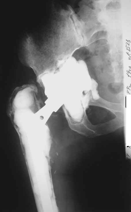 Апрель 2005 |  Декабрь 2005 |  Декабрь 2005 | Реревизия по поводу нестабильности вертлужногокомпонента была выполнена в апреле 2005 г. с пересадкой вертлужной впадины (аллотрансплантат)и защитой трансплантата кольцом Б-Ш.Нагноение выявлено через 6 месяцев, был полностью удален эндопротез (и вертлужный и бедренный компоненты), тщательная ХО мягких тканей с установкой подготовленной из цемента с антибиотиками (родной гентамицин + насыпной ванкомицин) вертлужной впадины опять же на цемент. Установлена новая ножка взамен удаленной на к/цемет с антибиотиками. Рана зажила, б-ая выписана домой. По этой методике прооперировано четверо б-х, пока без рецидива инфекции, одна из пациенток уже поступила для второго этапа.С уважением, Р.Тихилов