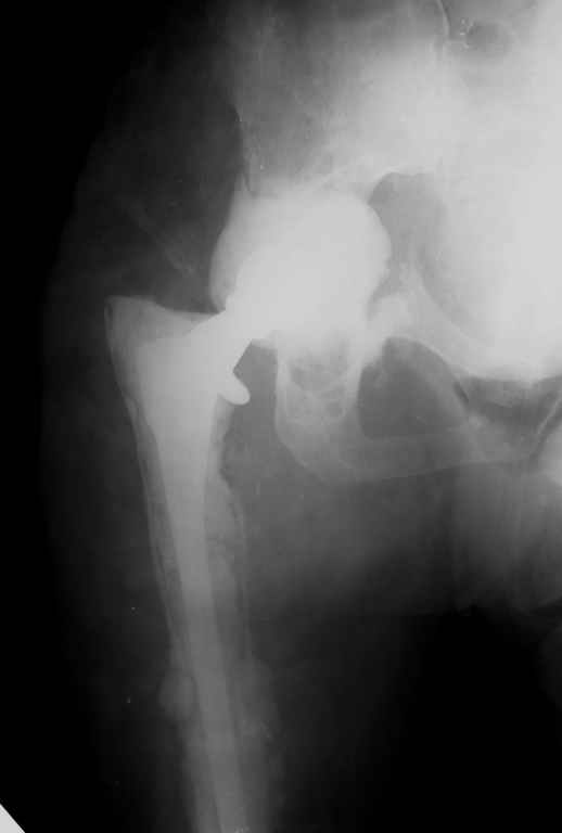 Мы установили временный протез предназначенный только для движений и ходьбы без нагрузки. "Старый" цемент мы не удаляли поэтому спустя 3-4 месяца планируется выполнить расширенную остеотомию бедра с удалением всего к/цемента и установкой ножки бесцементной фиксации. Обязательным условием является хорошая дистальная фиксация на протяжении минимум 6-8 см. Скорее всего мы используем изогнутую ножку длиной 254 мм, это будет либо ZMR, либо Solution, я еще не планировал этот этап операции.