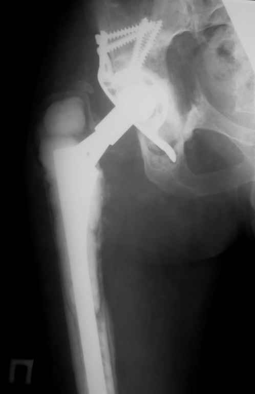 Большое спасибо за снимок, теперь все видно! Кстати, по этому поводу: в зоне бедренной кости кортикала осталось очень мало. Планируете ли Вы при окончательной имплантации менять эту ножку на другую (и если да, то на какую именно)?