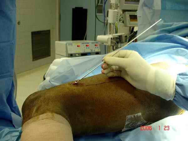 Методика штифтования при отсутствии большой зоны перелома как при онкологических профилактических штифтованиях, расверливание интрамедуллярного канала проводим с предварительным наложением дополнительного дренажного отверстия в дистальном отделе бедра (в данном случаи в канале оставили 6.5 мм канюлированный шуруп), иначе при создании давления в канале во время сверления имеется опасность эмболизации легочной артерии тромбом.