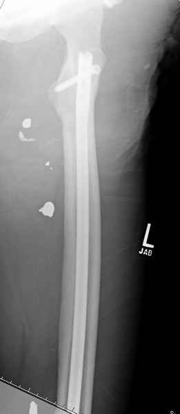 Учитывая, что больной получил травму не во время визита в церковь, и он является одним из представителем 40 миллионного “outstanding itizen”, без медицинской страховки, без работы в свои 39 лет, и без надлежающей ортопедической дисциплины у которого отсутсвует страх стрессового перелома, было рекомендовано оперативное лечение: профилактическое антеградное интрамедуллярное штифтование.