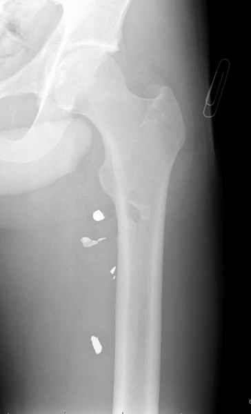 из Уважаемые коллеги. Больной с огнестрельным переломом бедра с вовлечением около 15% медиального кортекса, входное отверстие около 1 см в диаметре; стабильный, без сосудистых и неврологических признаков.