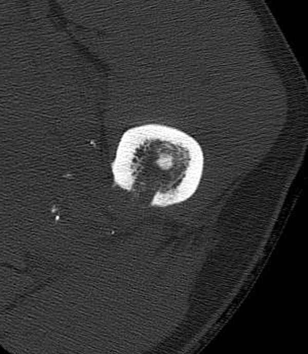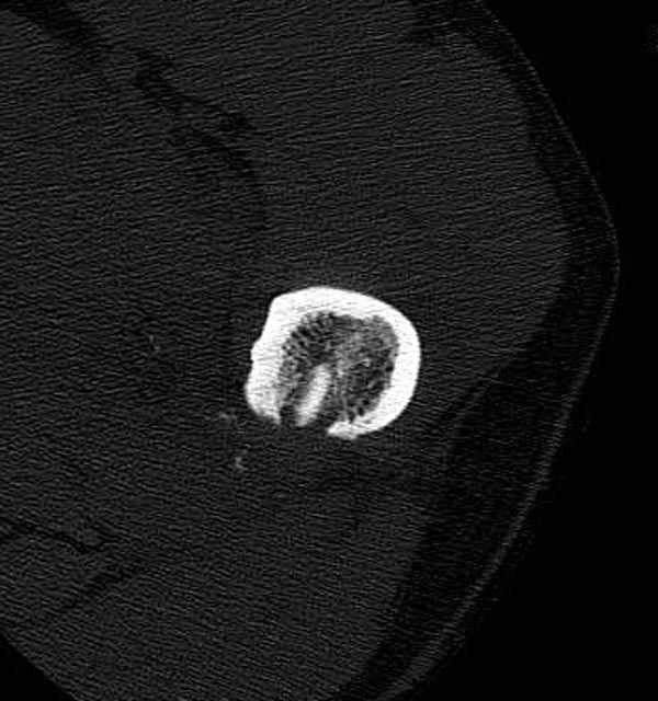 It looks to be a low velelocity injury probably a handgun or a pistol. The main considuration is the soft tissue injury and i would say that if their is no soft tissue injury i would not do any surgery except the debridment of the wounds.