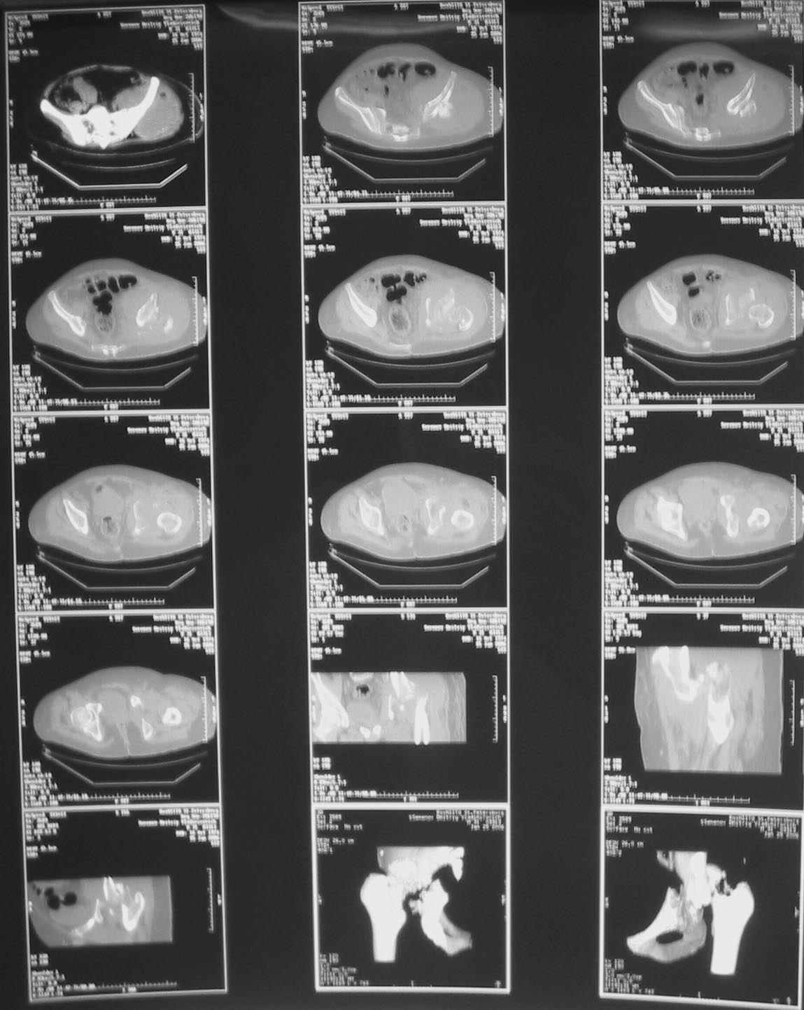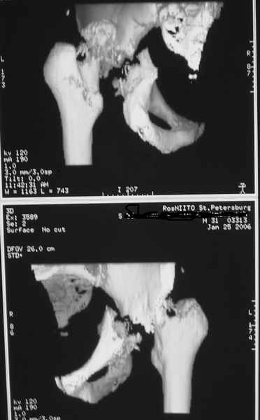 Однако, учитывая вывих, 5-месячный срок мы бы, наверно, без аппарата сразу забрались в сустав с целью его реконструкции и остеосинтеза винтами и пластинами. Если удастся сделать остеосинтез хорошо - сразу сделать и эндопротез. Доступ - есссно, не как на протез, а как на впадину - или Y-образный с остеотомией болшого вертела, или латеральный. В случае подозрения на нестабильность впадины после остеосинтеза или больших трудностей при синтезе - засунуть головку во впадину, сделать остеосинтез шейки винтами, и дождаться сращения впадины, попытавшись сохранить движения в суставе. Пишут, можно противопротрузионными кольцами или Octopus укрепить остеосинтез впадины, и тогда тоже делать протез сразу, но у нас такого опыта нет, в основном предпочитали делать в два этапа - сначала реконструкция впадины, потом протез, потому что в застарелых случаях впадина сильно кривая.