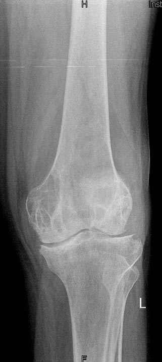 На рентгенограммах, помимо перелома, кистозные изменения на мыщелках б/берцовой кости и мыщелке бедра с другой стороны.