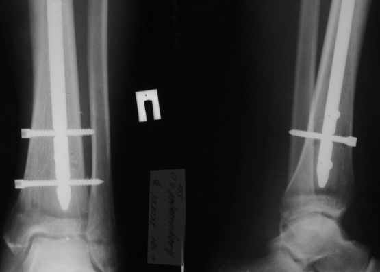 Голень лечили тем что было(стержень сплошной 9мм), при поступлении - ротационная подвижность в с/3 голени. Дистально поставили еще один сагитальный винт. Ротационная подвижность уменьшилась, но не полностью . В чем причина? тактика?