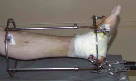 Учитывая сроки после травмы, я бы 1 этапом наложил дистакционный аппарат(будут трудности при одновременном восстановлении длины пятки, кроме того не надо забывать о возможных краевых некрозах). Удачи.