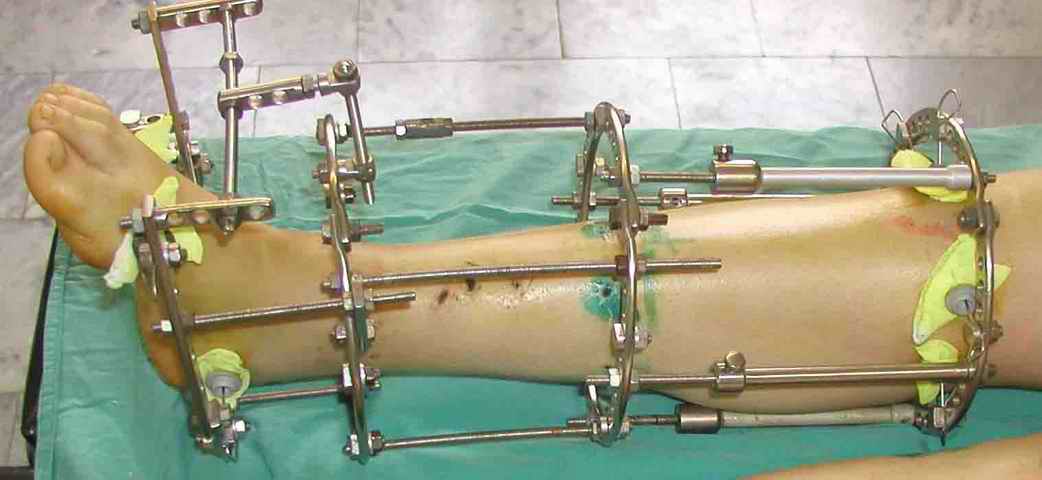 В качестве альтернативы - ограниченная, минимально инвазивная открытая репозиция суставного конца кости, фиксация спицами и винтами; продолжние аппаратной фиксации, уже со свободной стопой - месяца 2-3. После сращения дистального "блока" - закрытый интрамедуллярный остеосинтез.
