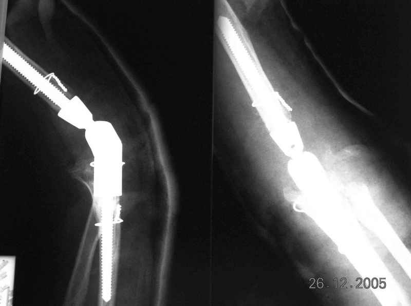 3. Total elbow replacement (semi constrained - as no ligaments to stabilize the joint) - Coonrad-Morrey, Discovery - Biomet - considering his age there is limited indication for that procedure.