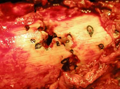 Уважаемые коллеги! С большим интересом следил за дискуссией о применении лазерного воздействия на остеомиэлитический процесс. Своего опыта использования лазера при данной патологии нет. но в городе был случай лечения патологического перелома голени, возникшего после лазерной остеоперфорации. В приложении картинка, на которой хорошо видны места бывших остеоперфораций.