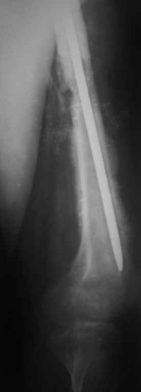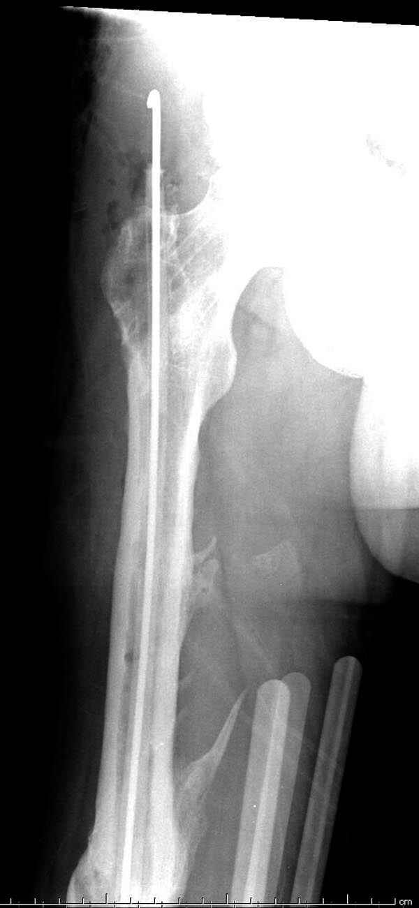 после промывки канала с рассверливанием внутреннего кортекса, через 4 недели антибиотический штифт удалили, оспалителный процесс остановлен и бедро сросся.