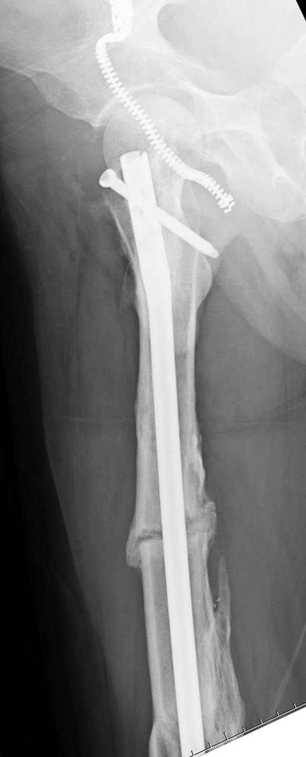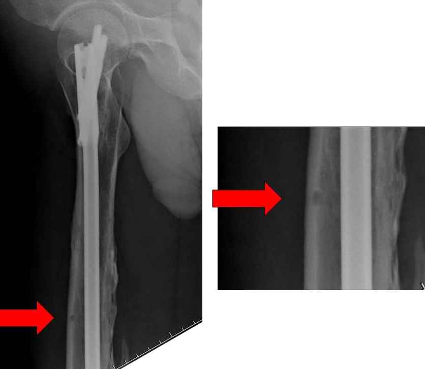 На представленных R-граммах нет снимков с АВФ. На снимке №4 дистальный статический винт не доходит до второго кортикала. Если это имелось ввиду, то хотелось бы уточнить, могло ли это привести к повторному перелому бедра, в котором интрамедуллярный штифт отсутствовал.