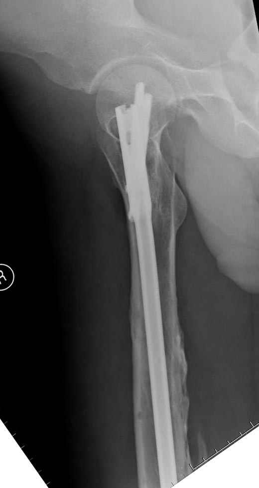 Учитывая, что на представленной ренгенограмме перелом сросся, я думаю достаточно будет такая импровизированная интрамедуллярная фиксация.