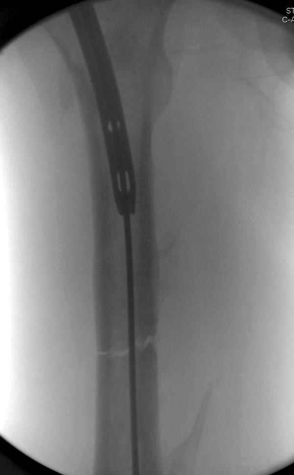 Рутинный интрамедуллярный остеосинтез с расверливанием и с фиксацией реконструктивным трокантерик штифтом (рис №1, №2),