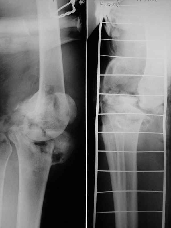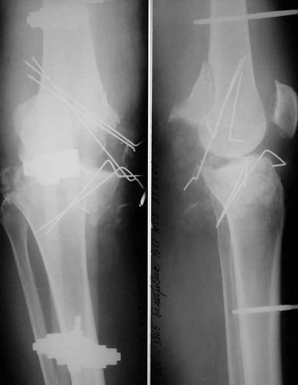 При поступлении - травматический шок 2 ст. При ревизии раны - отсутствие внутреннего мыщелка бедра, перелом внутреннего мыщелка б/б кости, нестабильность коленного сустава. Повреждений магистральных сосудов и нервов нет. Рваная лоскутная рана по внутренней поверхности колена. Выполнен адаптационный остесинтез остатков кости спицами и мостовидная трансартикулярная фиксация стержневым аппаратом внешней фиксации. Наводящие швы, частично - пластика по Хохутову. Сейчас раны заживают (местами с небольшими некрозиками, но в целом неплохо), встает вопрос о втором этапе лечения. Напрашивается вроде артродез коленного сустава. Возможно кто-либо имеет опыт лечения подобных случаев и может предложить нечто повеселее? С уважением, А.Ситник