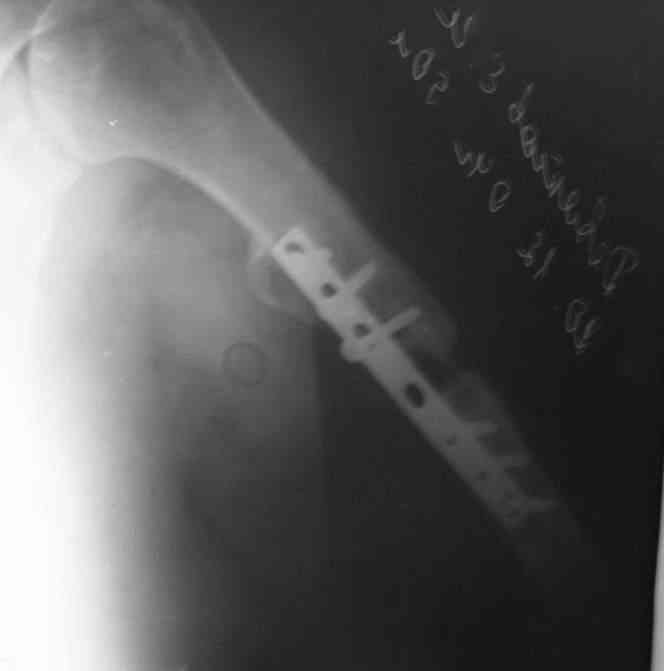 Штифт - отвисание проксимального отдела - накостный остеосинтез, нагноение, АФВ с ревизиями раны, опять пластина и снова нестабильность. Была удалена пластина и выполнен БИОС штифтом ChM (ДЕОСТ). Через 2 нед. пациент сел за руль и вышел на работу. Причем так и работает до сих пор уже 1,5 года, хотя полного сращения мы вроде бы не достигли ( снимки пришлю позже) - пациент не приходил на осмотры, общался только по телефону.
