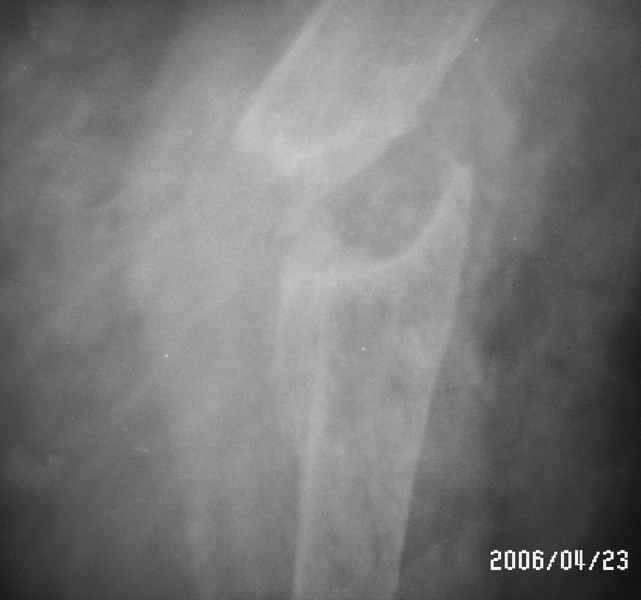 Уважаемые коллеги! Помогите в выборе тактики лечения больной Р.,56 лет, с болтающимся ложным суставом с/3 правой плечевой кости 2-х летней давности. В анамнезе - бронхиальная астма, гормонозависимая форма, ожирение III cт. Травма - автодорожная, получила закрытый многооскольчатый перелом диафиза плечевой кости со смещением (от метафиза до метафиза), в экстренном порядке нами произведен закрытый остеосинтез стержневым аппаратом, отломки удалось сопоставить анатомически. В дальнейшем больная выпала из поля зрения. Как потом выяснилось, после снятия стержневого аппарата, больная долечивалась по Илизарову специалистом из г. Кургана. Аппарат Илизарова удален из-за нагноения мягких тканей. Последние два года работая бухгалтером, фиксирует плечо ортезом. Теперь вновь обратилась к нам для ликвидации ложного сустава.