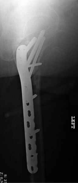 Применили проксимальную Synthes Locking plate, из-за множественных фрагментов посчитали более приемлемым в этом случае (клиника университетская, резиденты должны имет возможность созерцать разные варианты остеосинтеза).