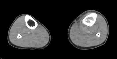 При обращении к нам произведена сцинтиграфия скелета - зоны гиперфиксации РФП: верхняя треть голени- 960%, нижняя треть бедра - 380%, Дистальный метафиз голени и затылочная область - 140%. В легких - метастазов нет. Произведена КТ (картинки в приложении). Учитывая абсолютную нестыковку рентгенологических и морфологических данных повторно биопсия. Выявлено, что первичная биопсия выполнялась из поверхностной параоссальной зоны - там локализованы хрящеподобные массы, далее очень плотная кость без хрящевых участков - биоптат взят фрезой с большим трудом. Морфологического заключения пока нет. Хотелось бы узнать Ваши варианты диагноза и соответственно тактику.