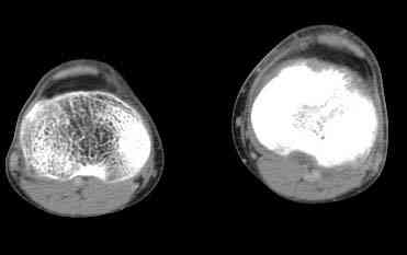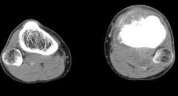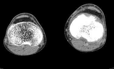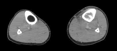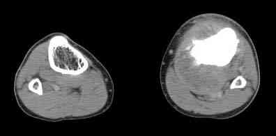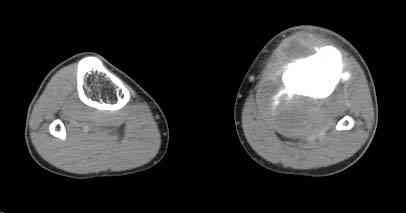 важаемые коллеги! Поступил больной 22 лет. Болен с января 2006 - появились боли в области верхнейтрети голени. При первичном осмотре в поликлинике был заподозрен первично-хронический остеомиелит - осмотрен гнойным хирургом - произведена биосия . Заключение - хондросаркома. Осмотрен онкологом - с учетом характера опухоли - химиотерапия, лучевое лечение не показано. Предложена либо ампутация, либо решение вопроса о возможности выполнения органосохраняющей операции. При обращении к нам произведена сцинтиграфия скелета - зоны гиперфиксации РФП: верхняя треть голени- 960%, нижняя треть бедра - 380%, Дистальный метафиз голени и затылочная область - 140%. В легких - метастазов нет. Произведена КТ (картинки в приложении). Учитывая абсолютную нестыковку рентгенологических и морфологических данных повторно биопсия. Выявлено, что первичная биопсия выполнялась из поверхностной параоссальной зоны - там локализованы хрящеподобные массы, далее очень плотная кость без хрящевых участков - биоптат взят фрезой с большим трудом. Морфологического заключения пока нет. Хотелось бы узнать Ваши варианты диагноза и соответственно тактику.