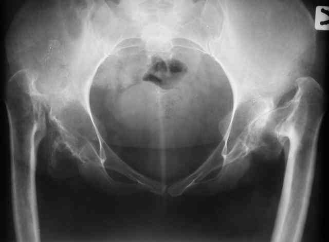 из Уважаемые коллеги! В клинику обратилась больная 30 лет с жалобами на боль в области тазобедренных суставов (больше справа), ограничение движений в них. Дисплазия была выявлена в 3-летнем возрасте, от операции родители тогда отказались. Около года назад при подъеме с кресла почувствовала резкую боль и хруст в правом бедре. С тех пор ходит только с ходунками. Выражены сгибательно-приводящие контрактуры. Справа - положительный симптом прилипшей пятки.
