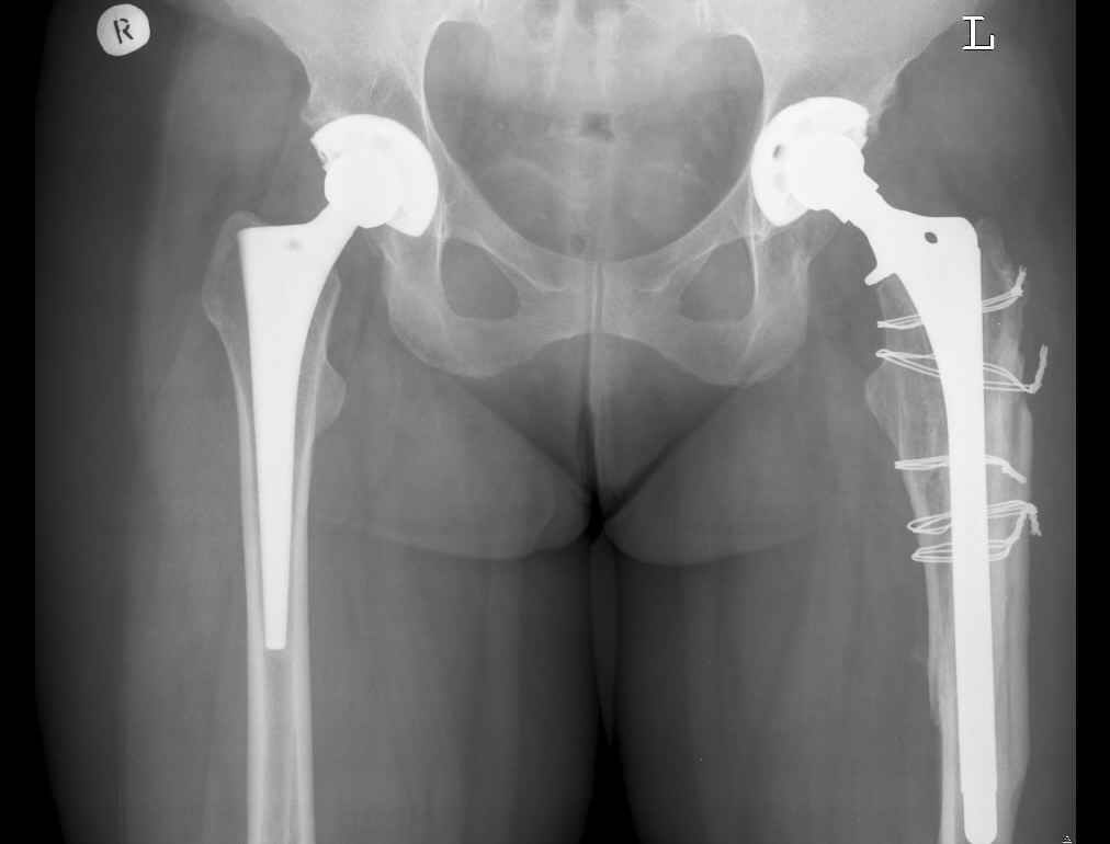 Анамнез: Болеет с 1995 года. В 2000 и 2001 годах произведено тотальное эндопротезирование обоих тазобедренных суставов (сначала левого затем правого). Сейчас в области левого бедра в в/3 имеется резкий отек, боль, крепитация. Диагноз:Состояние после тотального эндопротезирования обеих Т\Б суставов, перелом в/3 левого бедра. Нога уложена на шину Беллера с дисциплинирующим вытяжением. Тактика оперативного лечения? Заранее благодарю! С уважением, А.В.Владзимирский Донецкий НИИ травматологии и ортопедии