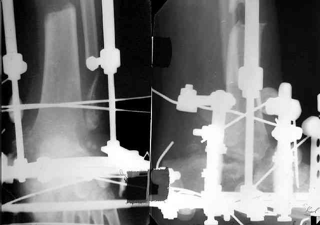 > кости. Выполнена ПХО, фиксация голени и стопы стержневым аппаратом.