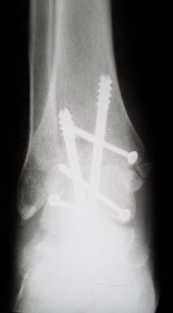 При применении шурупов для фиксации, рекомендуется применение 6.5 или 7мм каннулированных шурупов с шайбой, через пятку направленному к переднему кортексу (придасть стабильность) большеберцовой и если имеется возможность провести второй паралельно или под углом, причем на разных уровнях кортикального слоя иначе спереди большеберцовой