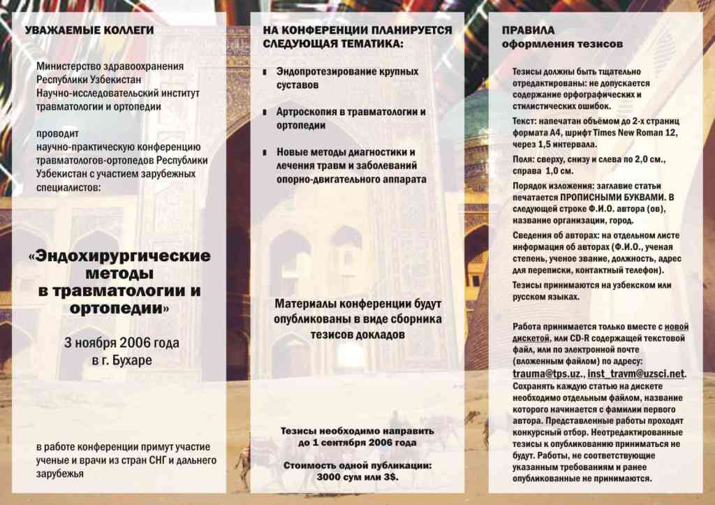 из Уважаемые коллеги! Приглашаем Вас к участию на конференции травматологов-ортопедов в г.Бухаре 3 ноября 2006 года. Подробная информация во вложенном файле. Мы рады встрече с Вами в исторической жемчужине Центральной Азии, приятно удивляющей многочисленных гостей своим гостеприимством, красотой и восточным колоритом.