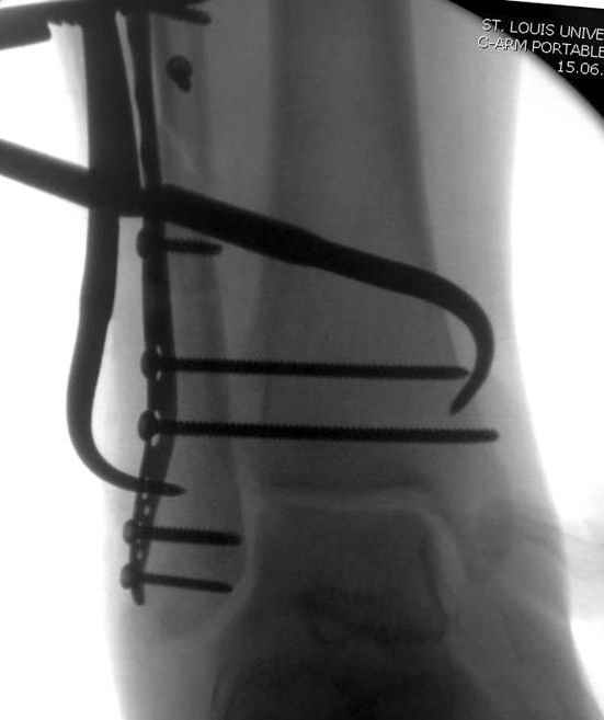 Для облегчения удаления сломанных шурупов (случается часто) рекомендую фиксацию двумя 3.5мм кортикальными шурупами на 3 мм длиннее, тот же сломанный шуруп легко удаляется с медиальной стороны.