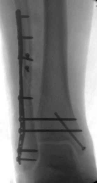 С мнением «провести позиционный межберцовый винт чуть ниже пластинки в положениий тыльного сгибания стопы» согласен, но я бы нагрузку начал через три недели и удаление шурупа можно провести через 6-8 недель.