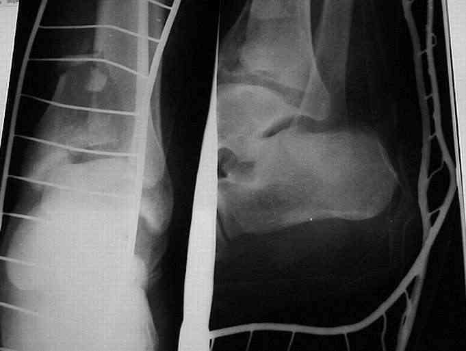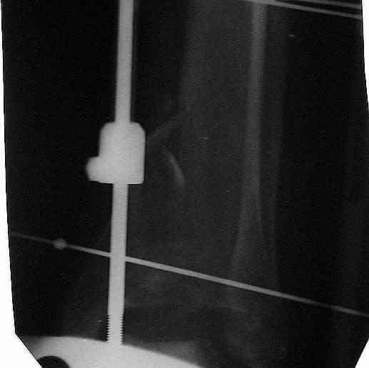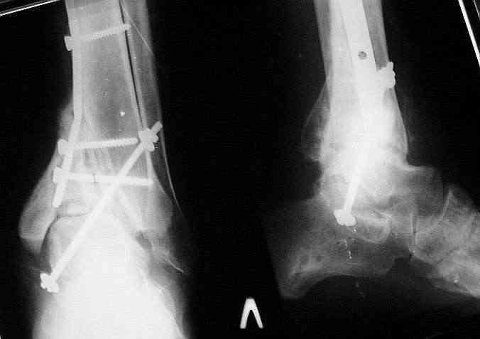 Здравствуйте, коллеги.Больной 26 лет, в 2004 году попал ко мне с диагнозом:синтезированный в аппарате Илизарова неполный внутрисуставной оскольчатый перелом дистального метафиза левой большеберцовой кости со смещением; выраженный остеопороз; множественное спицевое нагноение. Несостоятельность фиксации (костные отломки буквально "елозили" по спицам, несмотря наналичие упорных площадок). Было решено, уже по ходу операции, выполнить артродез болтом-стяжкой, тем самым компрессируя резецированные суставные поверхности и смещая стопу латерально, дабы нивелировать варусную деформацию и восстанавливая тем самым опорную ось всей конечности. Послеоперационный период без особенностей. Вчера (прошло около 8 месяцев)больной обратился ко мне в очередной раз с жалобами на боли умеренно-жгучего характера в области выстояния концов болта-стяжки. На момент осмотра:укорочение левой нижней конечности на 1,5 см; гипотрофия медиальной группы мышц голени и четырехглавой мышцы бедра; передвигается без дополнительной опоры в ортопедической обуви на растояние до 5 км; работает приемщиком цветных металлов (приходится перетаскивать грузы). Нарентгенограмме, насколько это можно видеть, костного блока сформировать не удалось, но движений в голеностопном суставе нет - ни активных, ни пассивных. Послеоперационные рубцы б/о; свищей и нагноения не было. Активно больногонаблюдать не приходилось, т.к. проживает в другом городе. Стоит ли необходимость удаления болта-стяжки из-за болевого синдрома? ЗЫ: Прошу прощения за очень низкое качество представленных ренгенограмм. Буду очень признателен за комментарии. -- С уважением, Заднепровский Никита Николаевич < | >