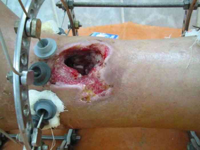 Состояние раны: постепенно очищается, заполняется грануляциями с участками фибрина. Воспаление мягких тканей вокруг раны купировано. В глубине раны, ближе к дистальному отломку, остается небольшой "гнилой угол" с весьма скудным отделяемым. Две "большие" перевязки в течение недели, с частичными некр- и секвестрэктомиями в условиях операционной.