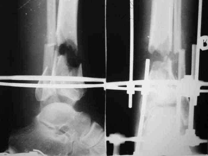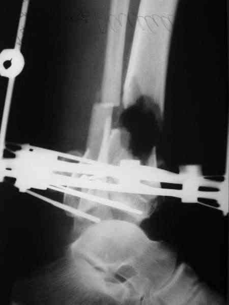 Срепонировать суставную поверхность мне не удалось. Только зря прошил ткани, а отломки остались в прежней позиции. Так и подмывало провести спицу через ахилл ... или пойти открыто задним доступом и притянуть винтом. Но смущает один момент: на чем будет держаться резьбовая часть винта, если передная поверхность разбита в хлам? Винт будеть елозить и не даст должной копрессии. Есть ли резон, при нынешнем состоянии раны, пойти на открытую репозицию заднего отдела суставной поверхности?