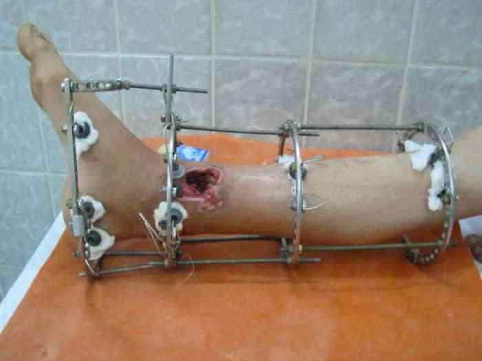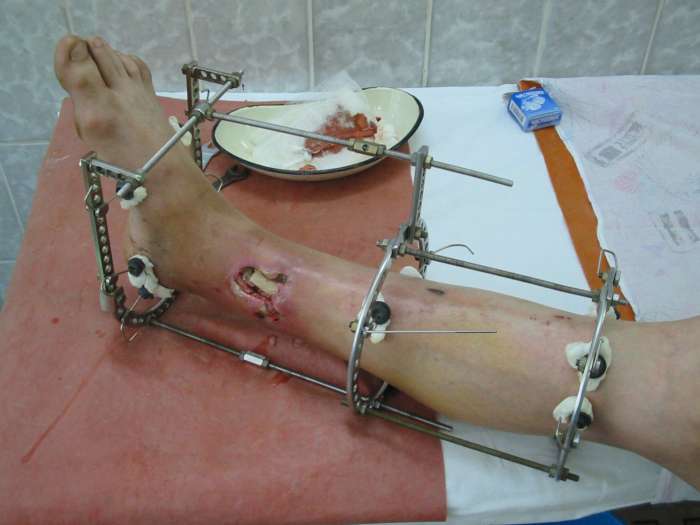 В понедельник в операционной выполнена санация раны с резекцией всех участков кости выступающих в просвет раны, удалены свободнолежащие фрагменты, некрэктомия. Промыто и заполнено салфеткой с некролитической мазью. Дополнительно проведена спица в с/3 голени. "Вытянул" голень до анатомичекой длины. После операции получил неприятный "сюрприз" - дистальный фрагмент б/б кости "разнесло". Снимки выложу завтра. Думаю опять ослабить дистракцию с целью собрать "в кучку" отломки дистального фрагмента, а также для