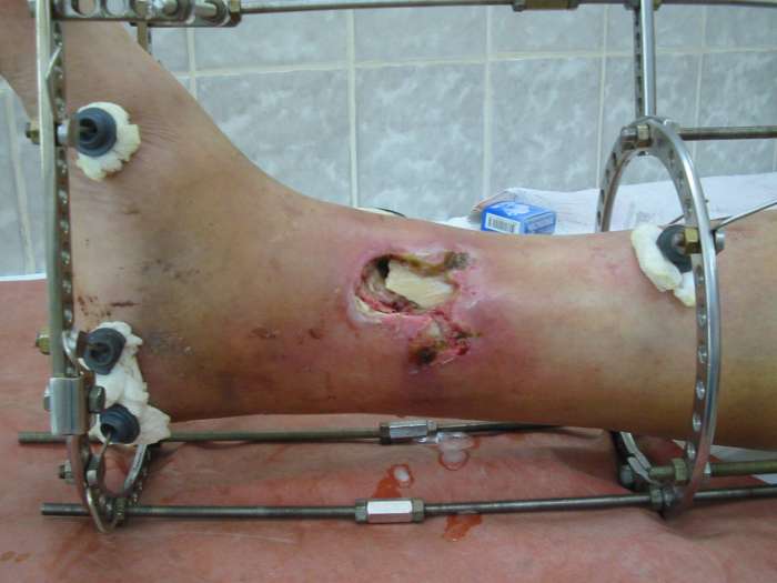 Наложен АВФ, на снимке результат сразу после операции и устранения "холостого хода". Ведется постепенная дистракция. Этапных снимков не проводил, т.к. по отломкам в ране можно ориентироваться в степени репозиции. Получает а/б по результату посева и антибиотикограммы отделяемого из раны.